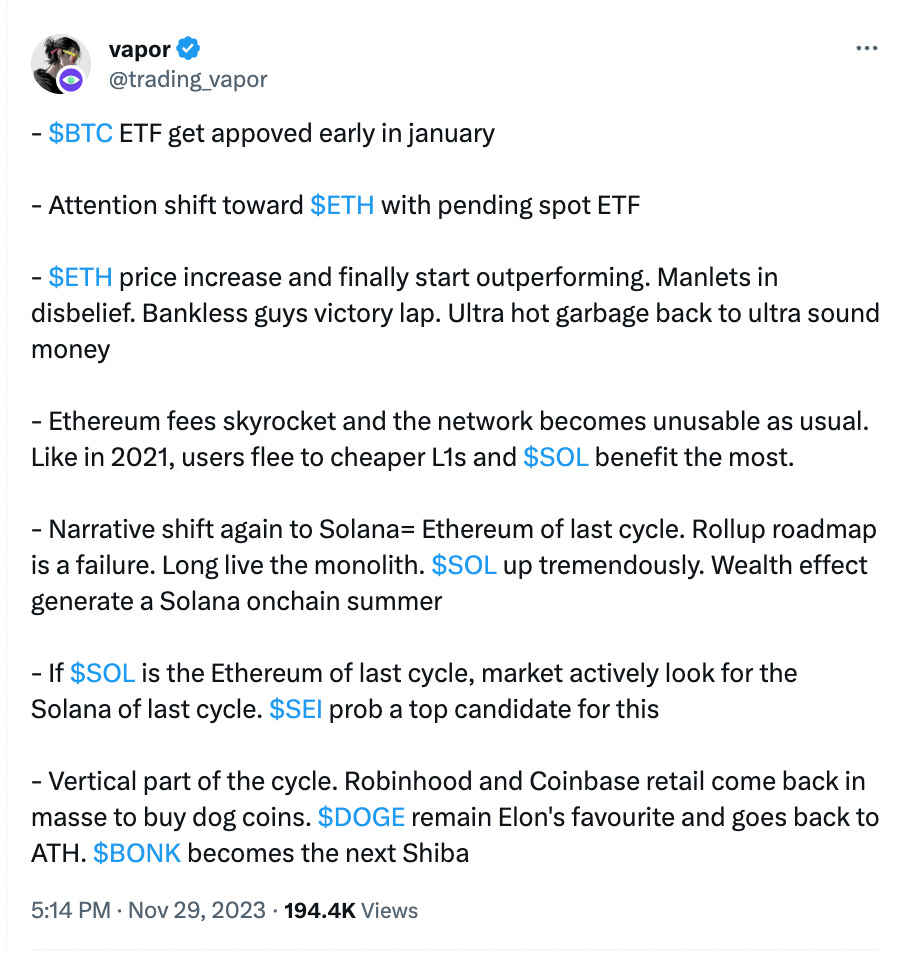 Secondly, we will closely monitor the Jito release. If there is no revaluation, we plan to buy this coin during the dump. Additionally, Solana's 24-hour NFT sales volume recently exceeded $9 million, showcasing the platform's thriving NFT ecosystem. Several NFT collections on Solana, such as Mad Labs, are currently performing strongly, with 158 SOL floor price, equivalent to 4.6 ETH.